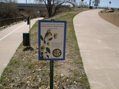 The Sand Creek Trail still has one spot where you ride on a road, under this railroad bridge. I think this route is the one the RTD Light Rail to Denver International Airport will take. One day soon you could be riding along and see harried travelers whooshing by.